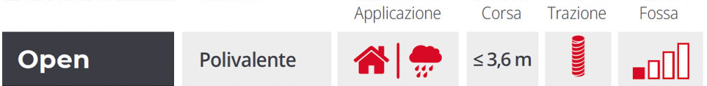 OPEN è la piattaforma versatile con un’ottima capacità di adattamento dimensionale ai vani esistenti. Con trazione elettrica a vite senza fine, MRL ed adatto sia per installazioni interne che esterne, con corsa fino a 3,60 mt, offre la possibilità di avere il cancello al piano alto che lo rende la soluzione ideale per mansarde, solai ed accessi a cantine, in modo che il prodotto sia poco invasivo.