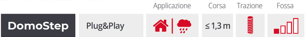 DOMOSTEP è la piattaforma entry-level facilissima e velocissima da installare perché premontata, che arriva in un unico pezzo. Con corsa fino a 1,3mt, l’installazione può essere fatta in mezza giornata. DOMOSTEP è la soluzione perfetta per installazioni che richiedono rapidità di fornitura ed installazione. Possibilità di stoccarla a magazzino perché la corsa può essere registrata durante l’installazione.